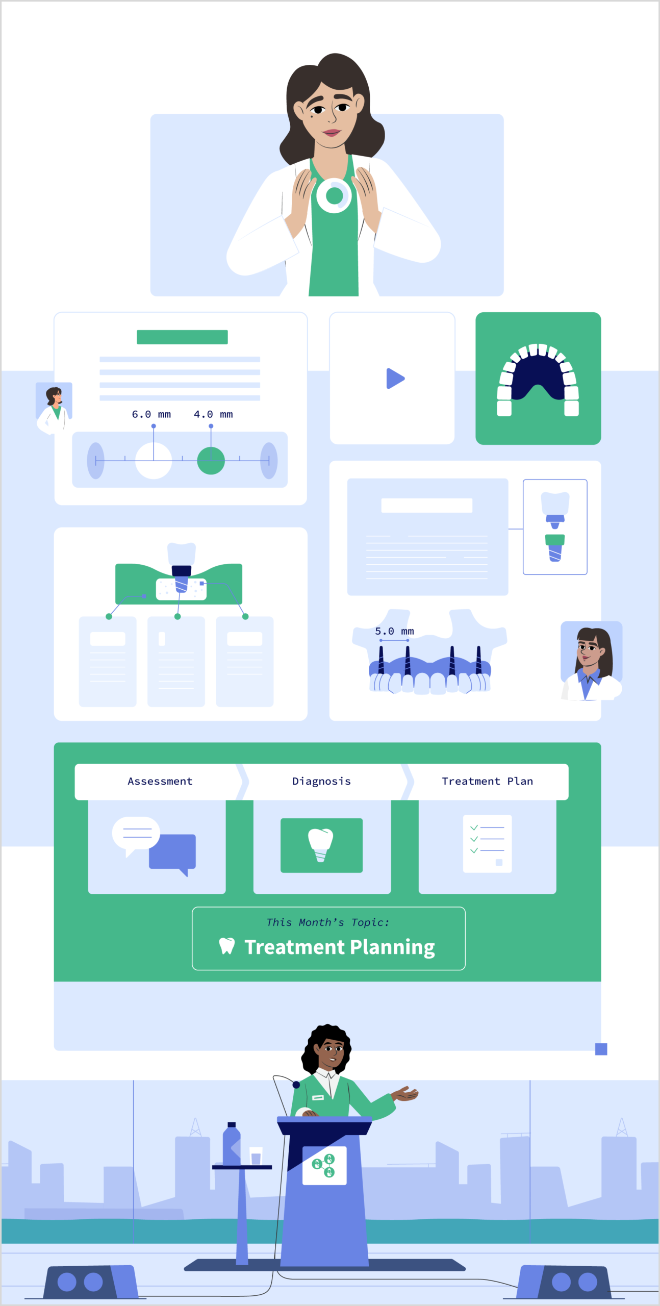 Global community explainer artwork showing a dental platform's digital interface and a treatment planning presentation for women in dentistry.